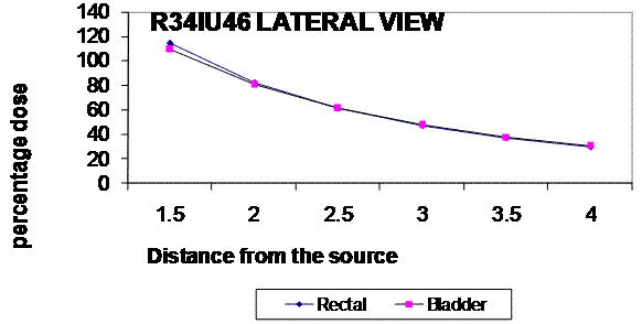 Figure 2. Relationship between the percentage dose prescribed to point A against distance from applicator, ring size 34 and tandem size 46 (R34IU46), to the ICRU rectum, bladder.
