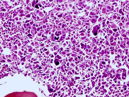 Figure 2. Bone marrow biopsy showing imature cells of variable size and some bone marrow fibrosis (at x 20 magnification).