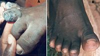 Figure 2. Dry gangrene of the right third toe secondary to leucocytosis (A). Right third toe showing complete resolution of gangrene (B) |