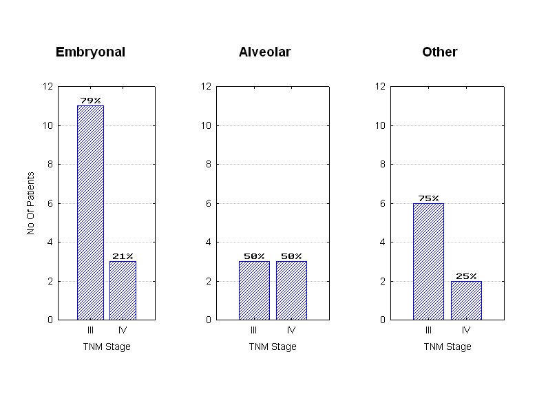 Figure 2. Correlation between stage and histology. The majority of embryonal and unspecified histological types were stage III disease. Alveolar histological types had equal numbers of stage III and stage IV disease.