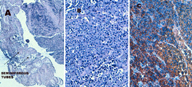 Figure 1. Plasma cell proliferation involving testicular parenchyma (A). Plasmocytoid cells (B). Tumor cells intensively marked by the anti-CD138 antibody on immunohistochemistry (C). |
